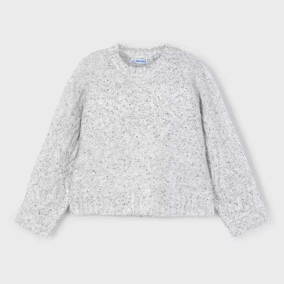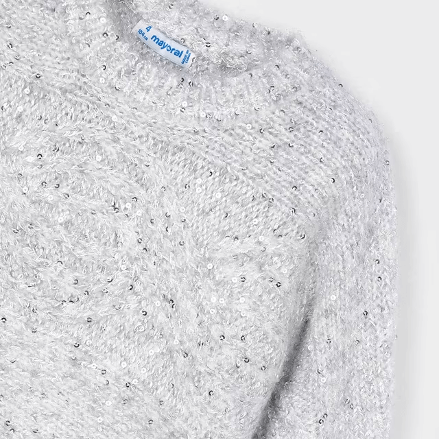 Contiene poliestere riciclato. Maglione manica lunga per bambina. Girocollo. Elementi decorativi: elementi decorativi intrecciati, paillette.