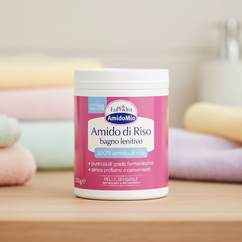 Parole chiave: amido di riso, polvere neonato, Euphidra AmidoMio, bagnetto neonato, pelle sensibile, prodotti neonato, irritazioni, corredino, regalo nascita, baby care
