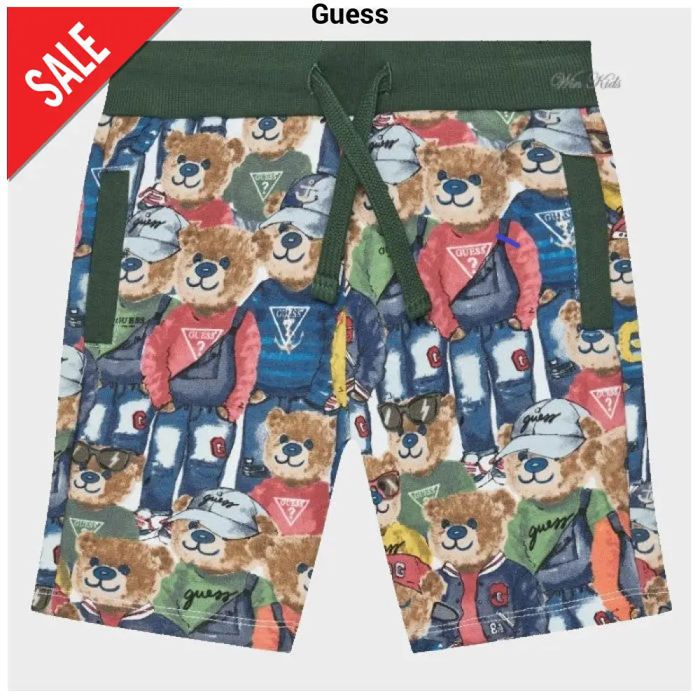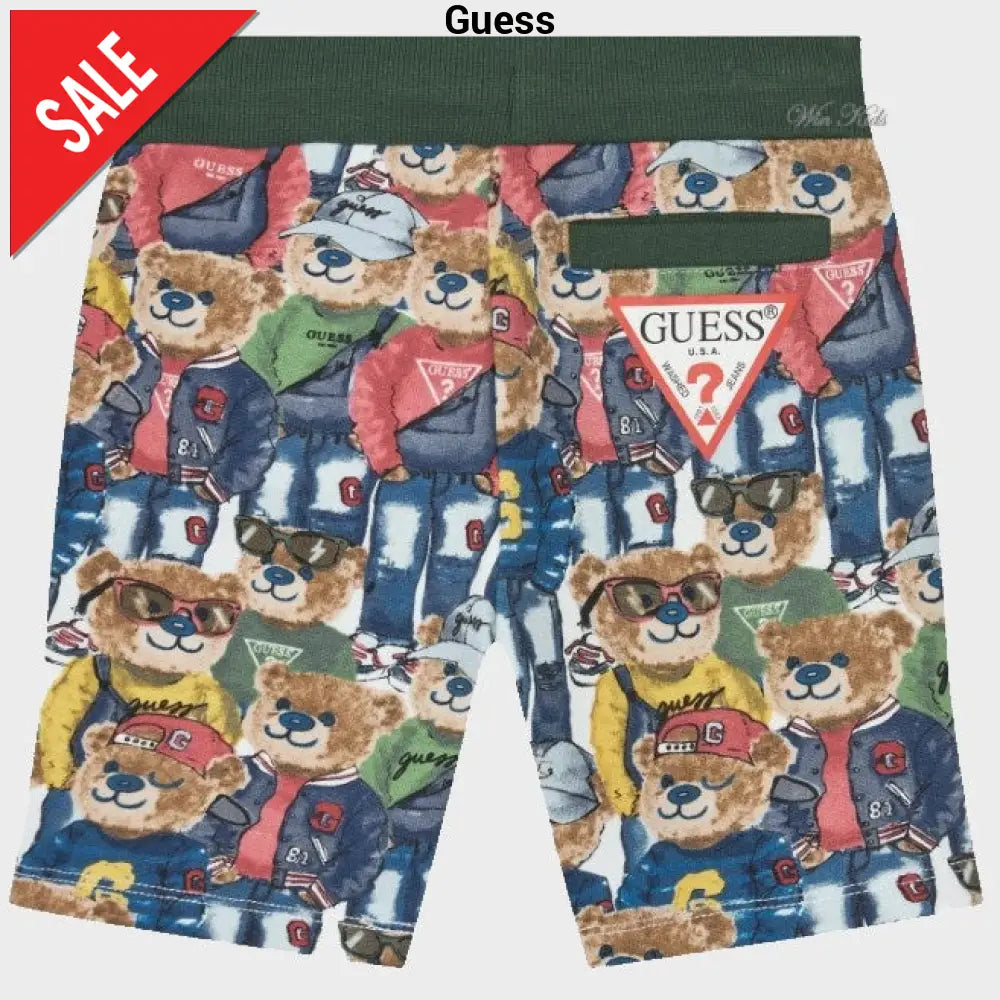 Bermuda GUESS in cotone garzato a fantasia con elastico in vita e laccetto. Logo stampato sul retro.