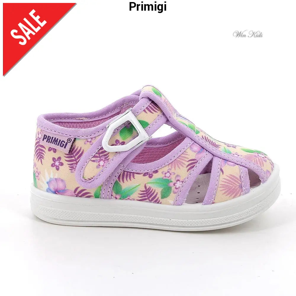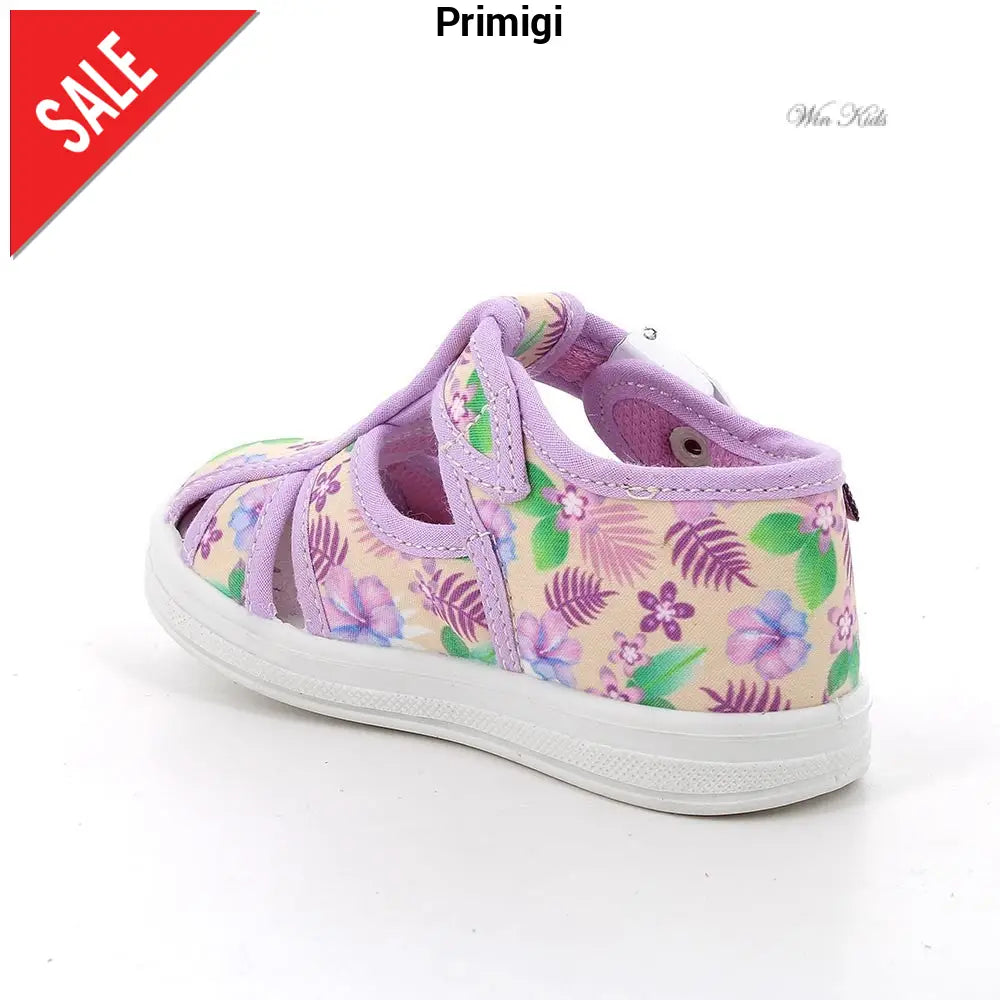 Sandali PRIMIGI primi passi modello ragnetto in tessuto a fantasia lilla , chiusura con clips , con sottopiede in pelle e fondo in gomma antiscivolo.