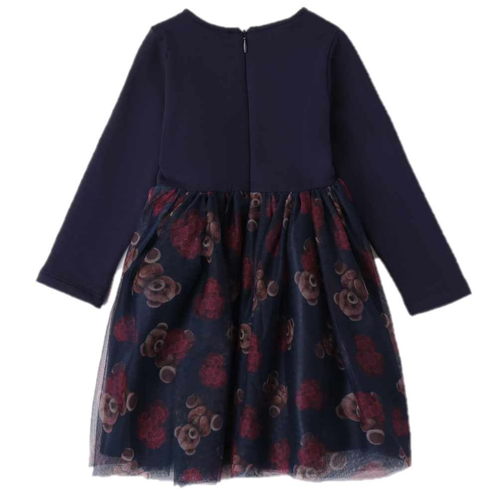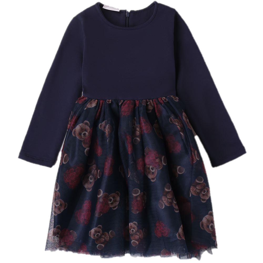 Abito SARABANDA con parte superiore in felpa con interno felpato e parte inferiore in tulle a fantasia, apertura con zip a scomparsa sul retro.