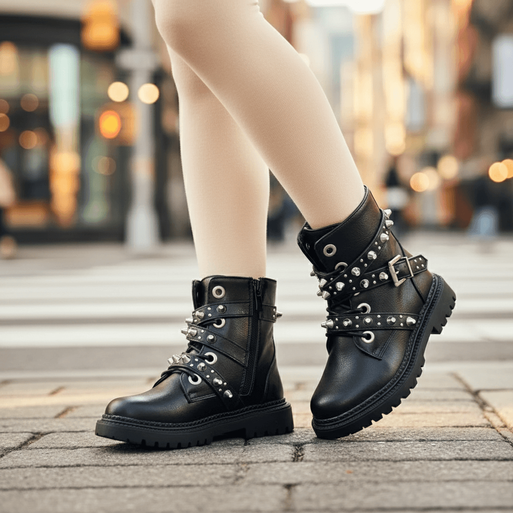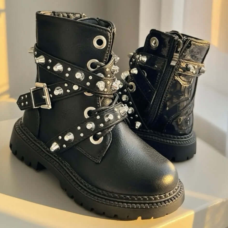 Anfibi neri con applicazioni, apertura con zip laterale, fondo in gomma antiscivolo.