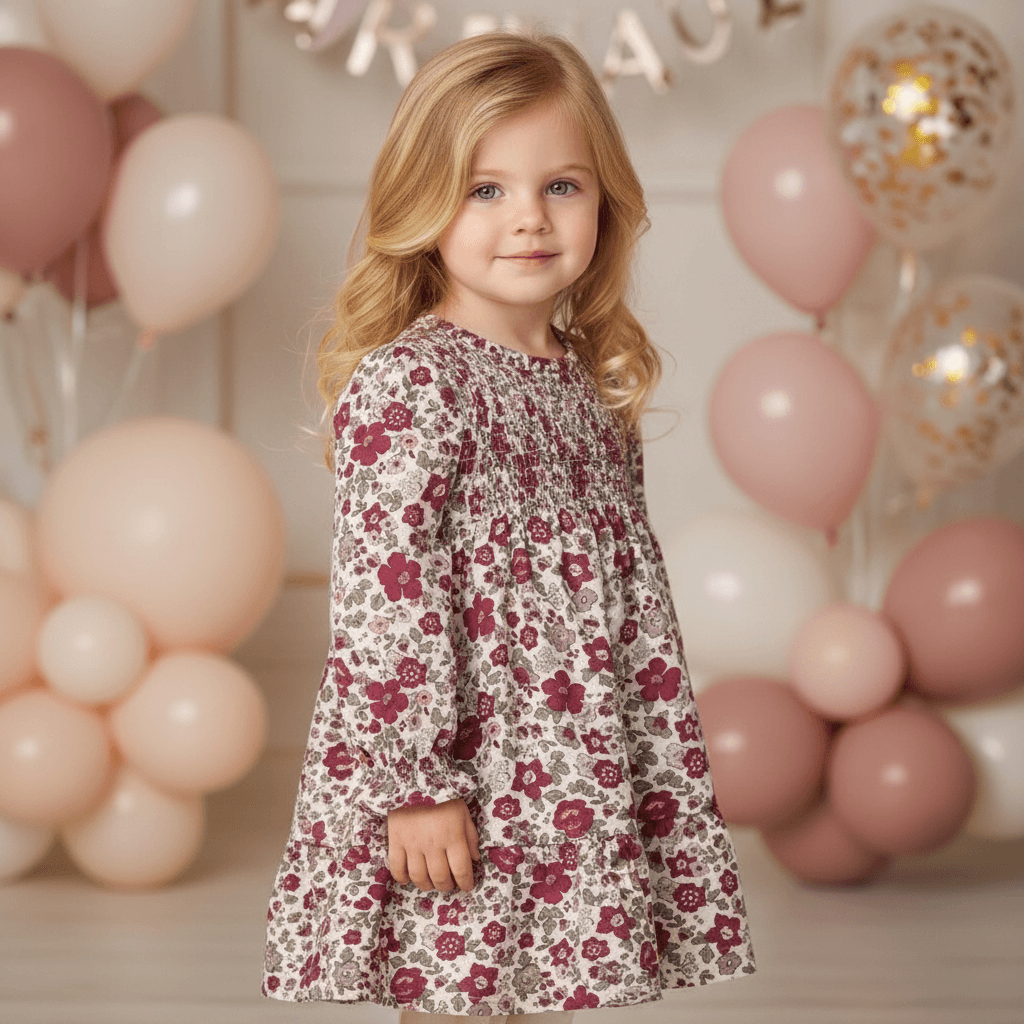 MAYORAL dress in patterned velvet, zip closure on the back, internal lining. Honeycomb smoke stitch workmanship.