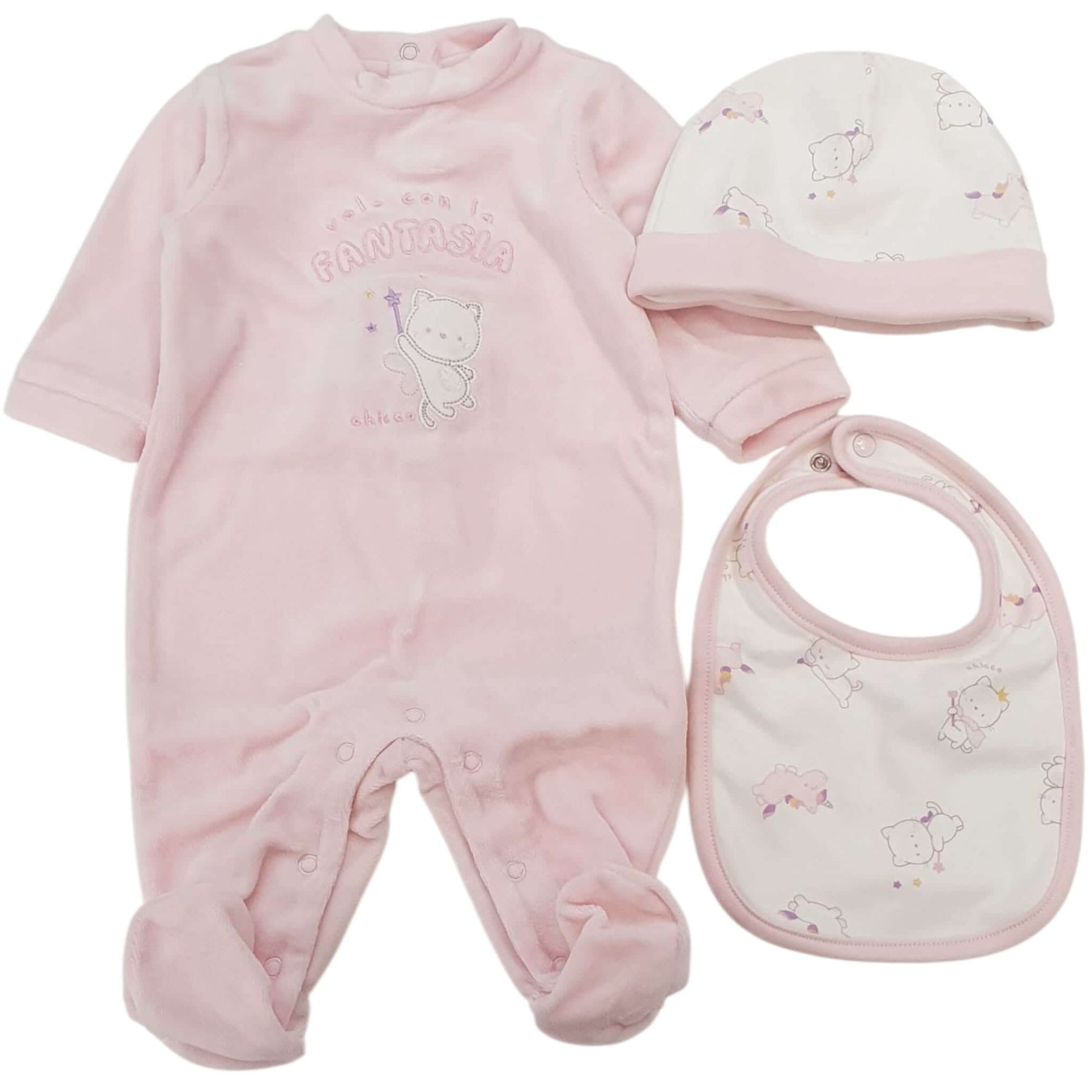 Complete CHICCO onesie, hat and pink female bib in gift box