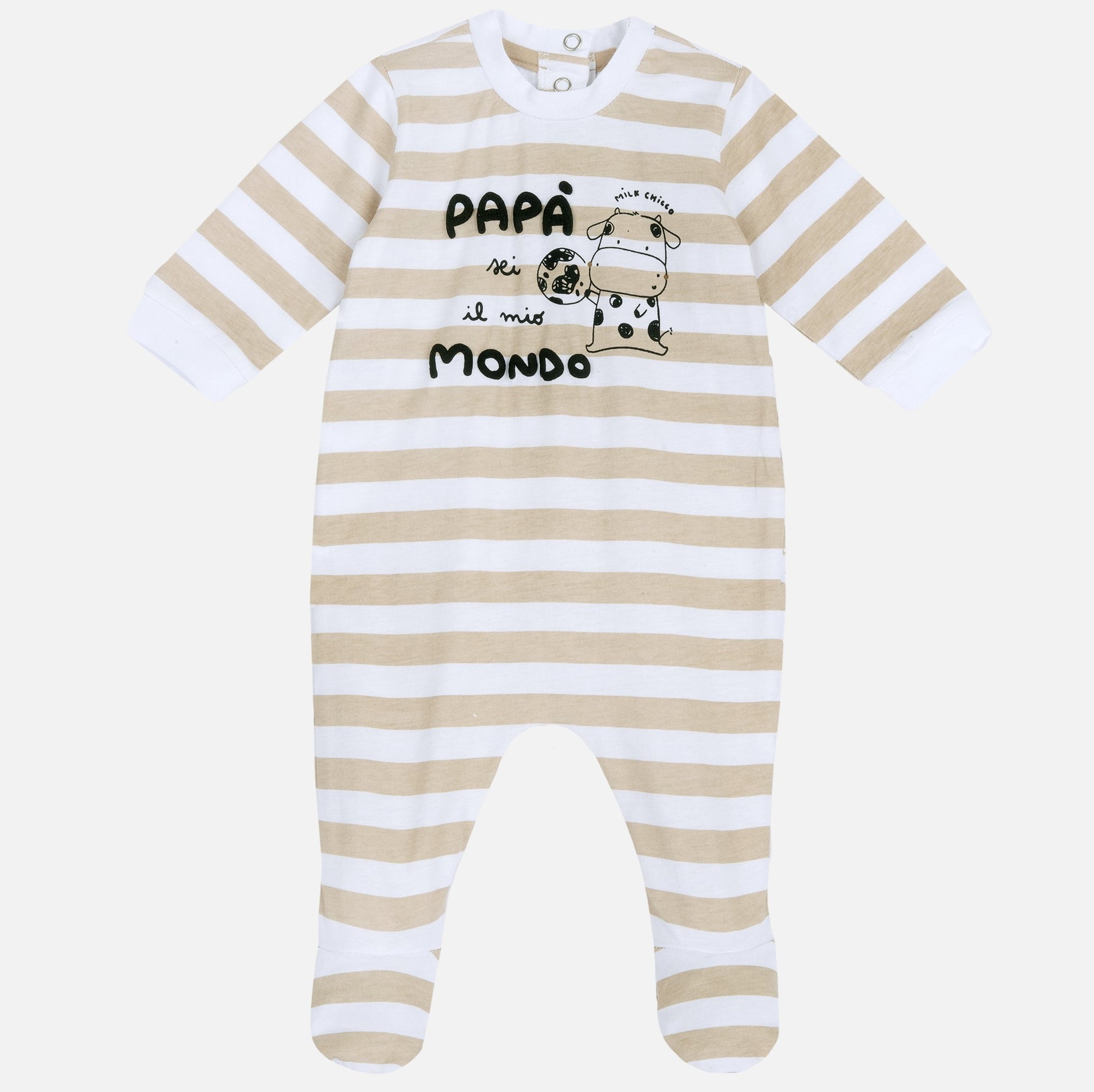 CHICCO cotton romper with striped pattern and contrasting color print, clip fastening on the back.