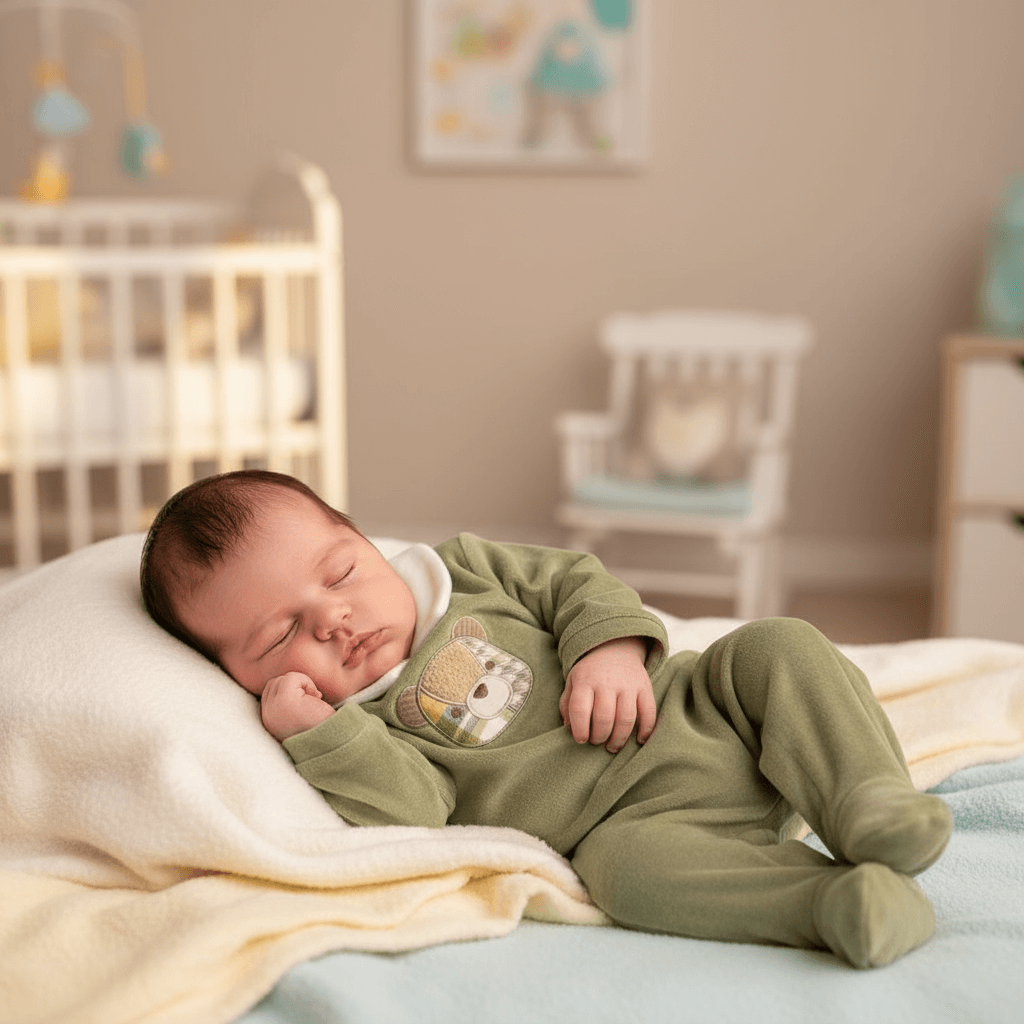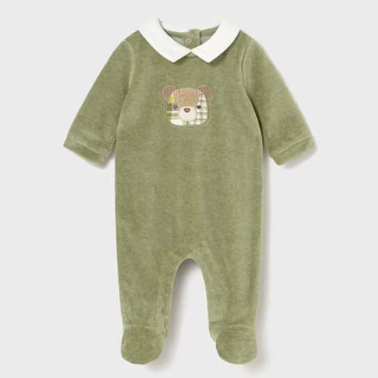 MAYORAL playsuit in green chenille with teddy bear patch and clip closure.