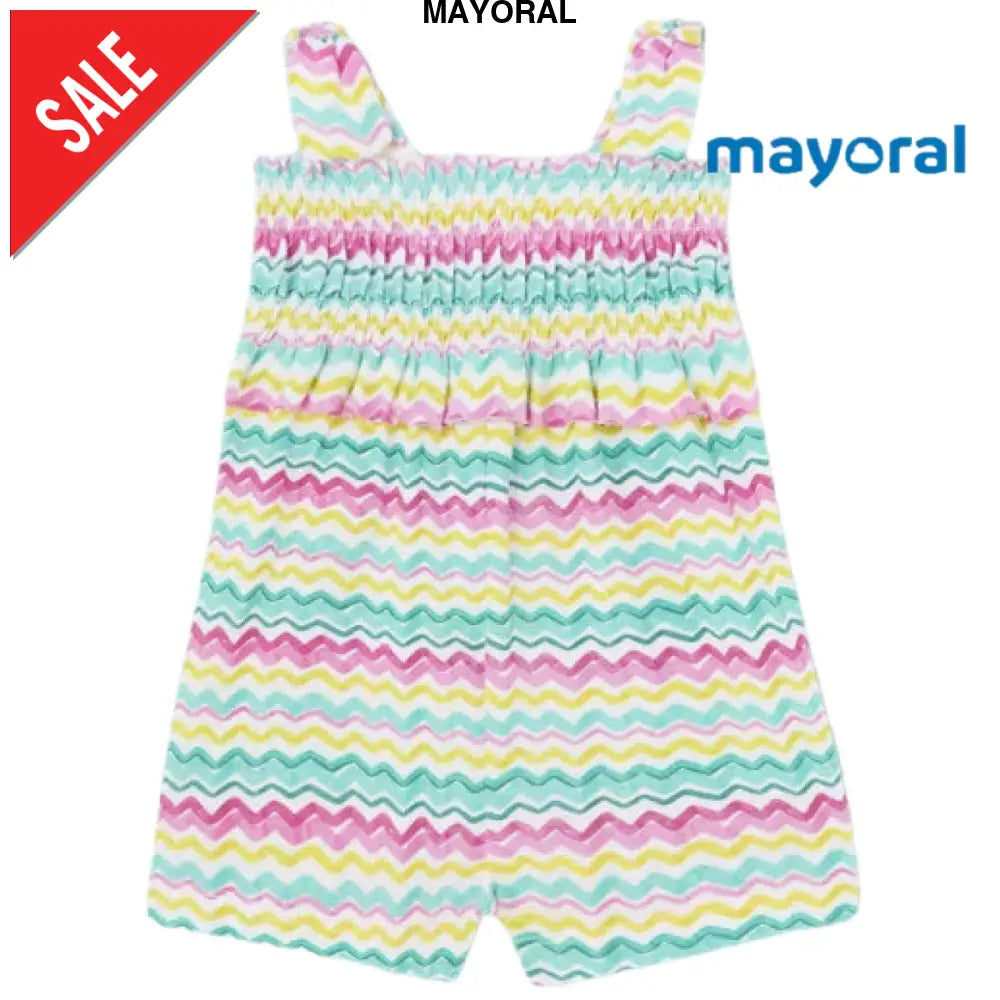 MAYORAL jumpsuit in patterned cotton with fake knot applied to the straps, elastic upper part for a comfortable fit, closure with clips.