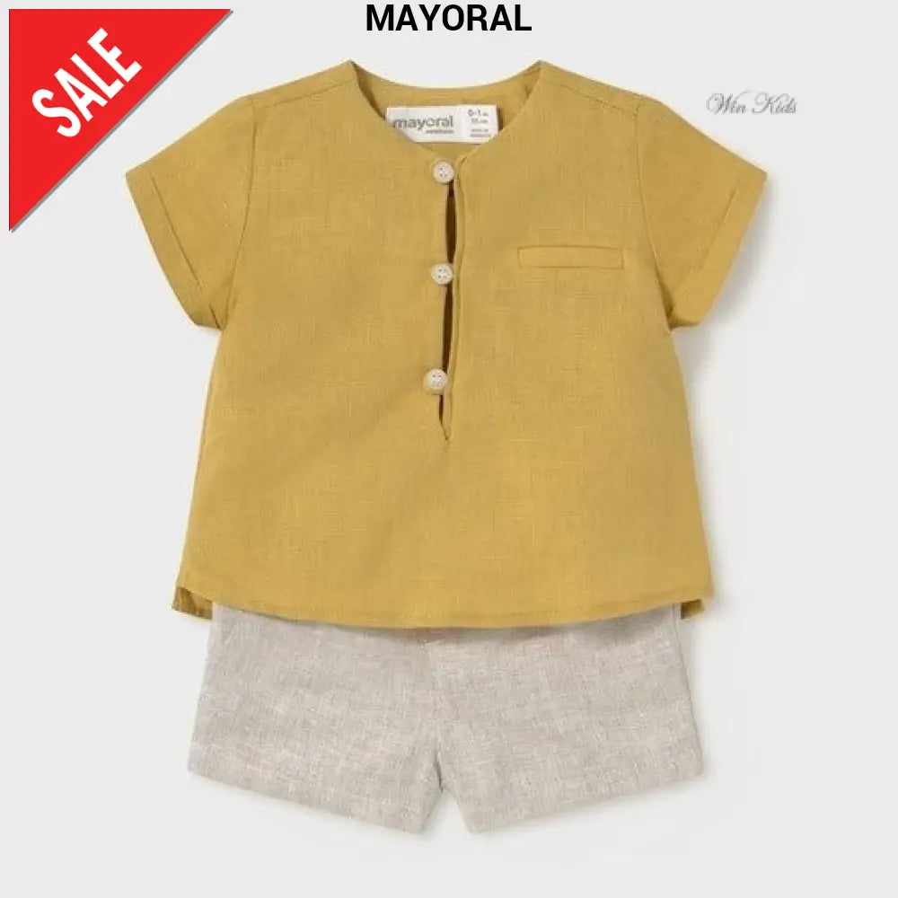 Mayoral linen blend suit consisting of short-sleeved shirt with fake pocket; Bermuda shorts with button fastening and elastic waist, fake pockets on the back.
