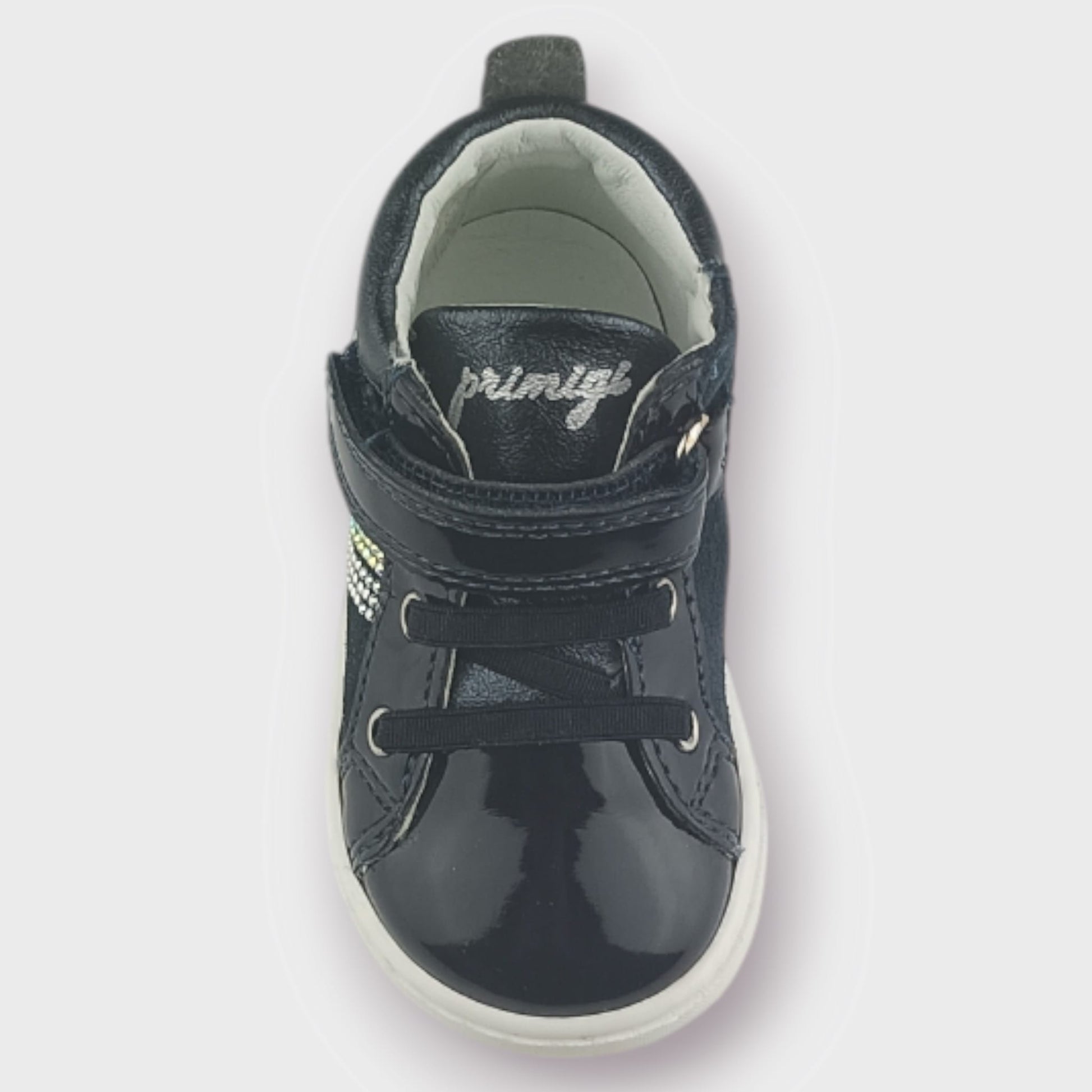 PRIMIGI first steps shoe in real leather with patent leather inserts, applied rhinestones, Velcro fastening and elastic lace, real leather lining and insole, light and flexible non-slip rubber sole.