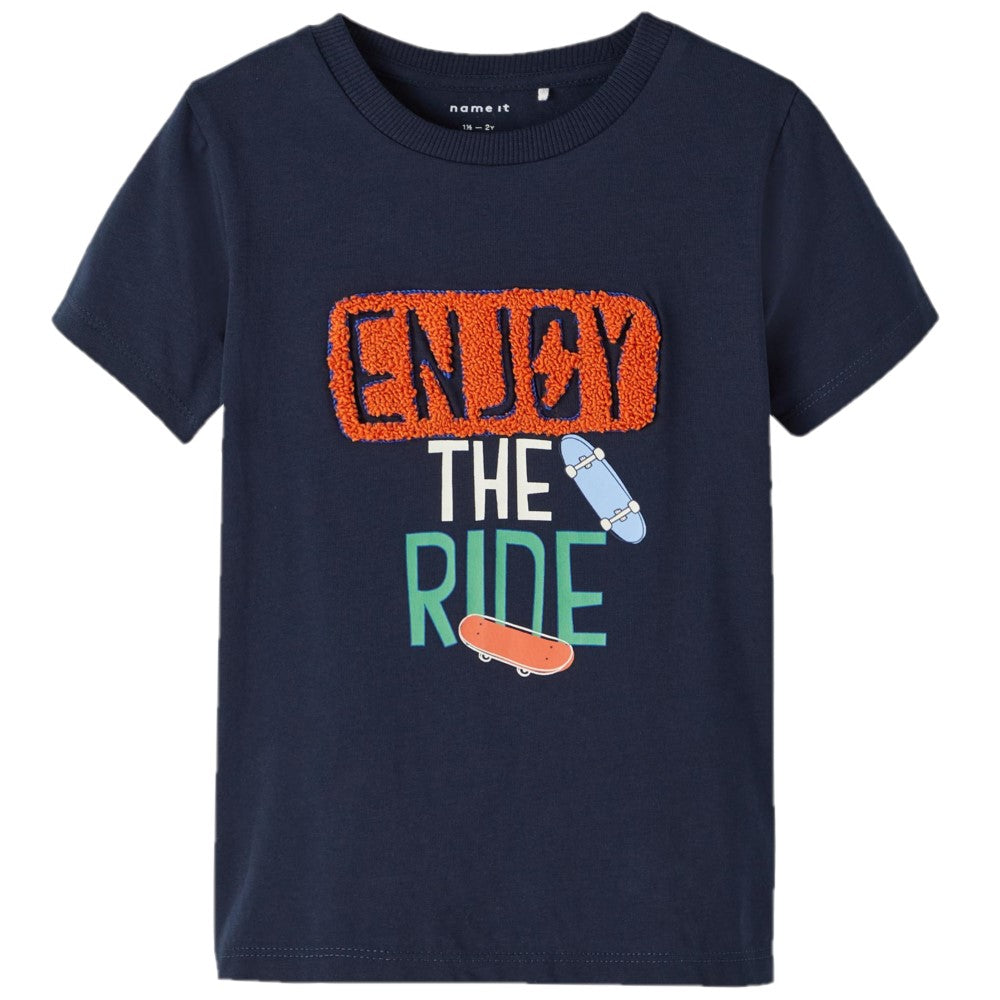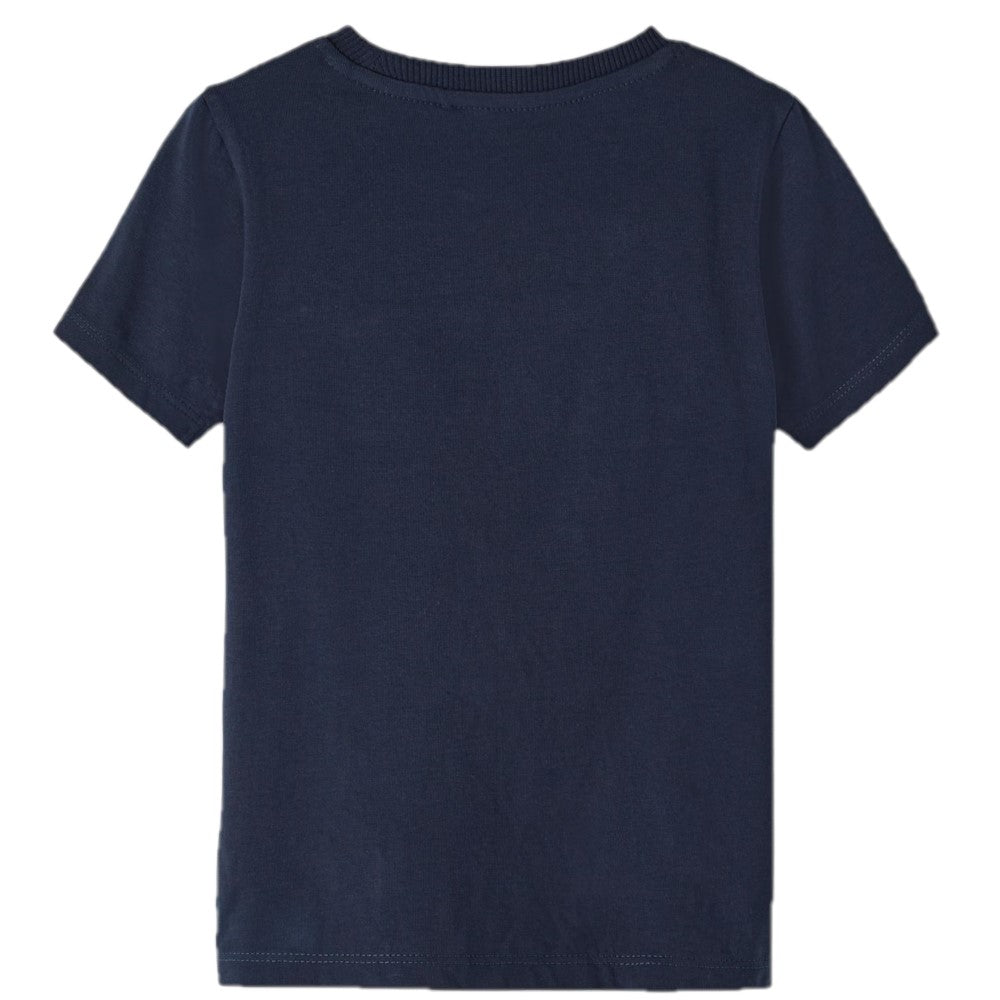 Camiseta NAME IT de media manga de algodón de color azul con logo en relieve y aplicación en tejido a contraste.