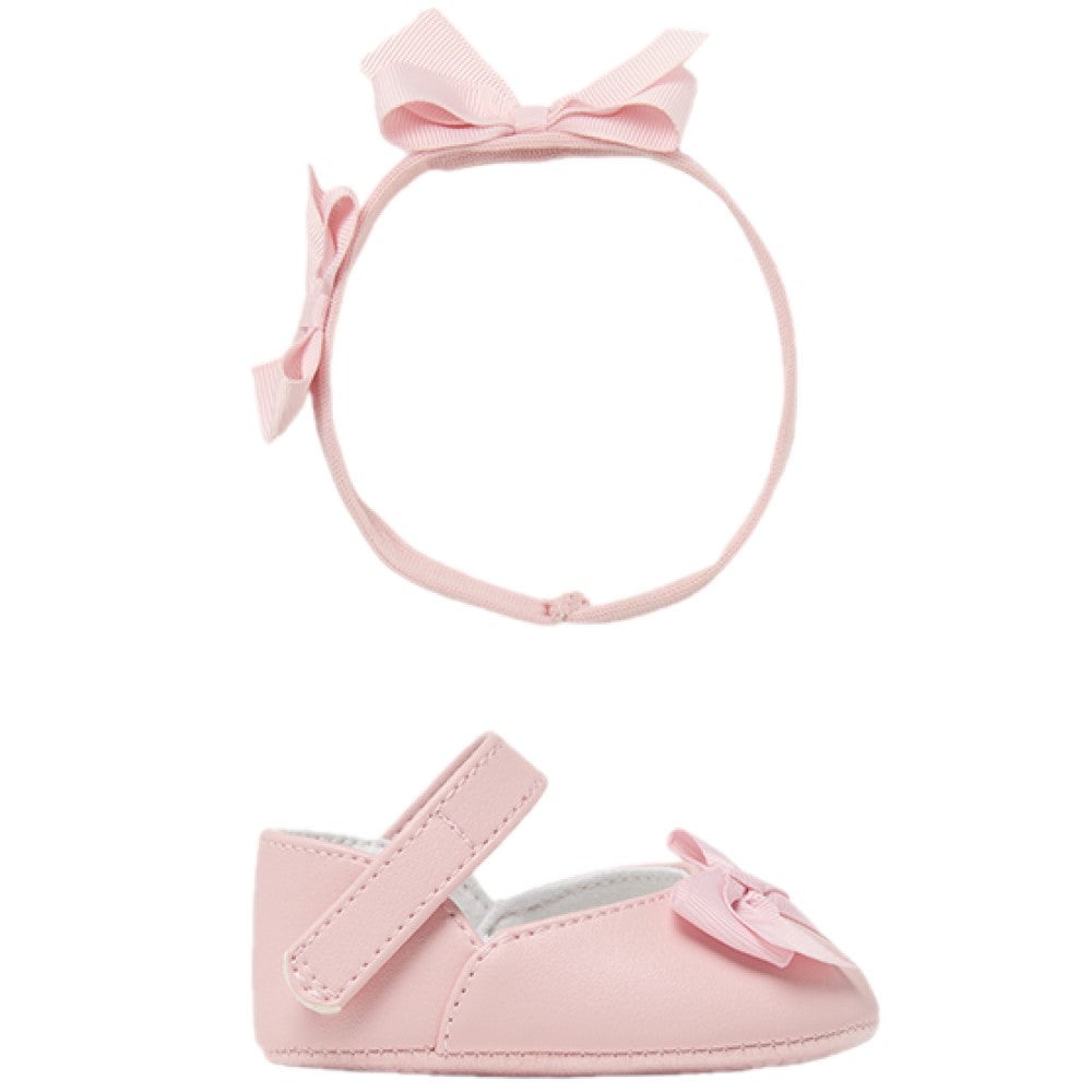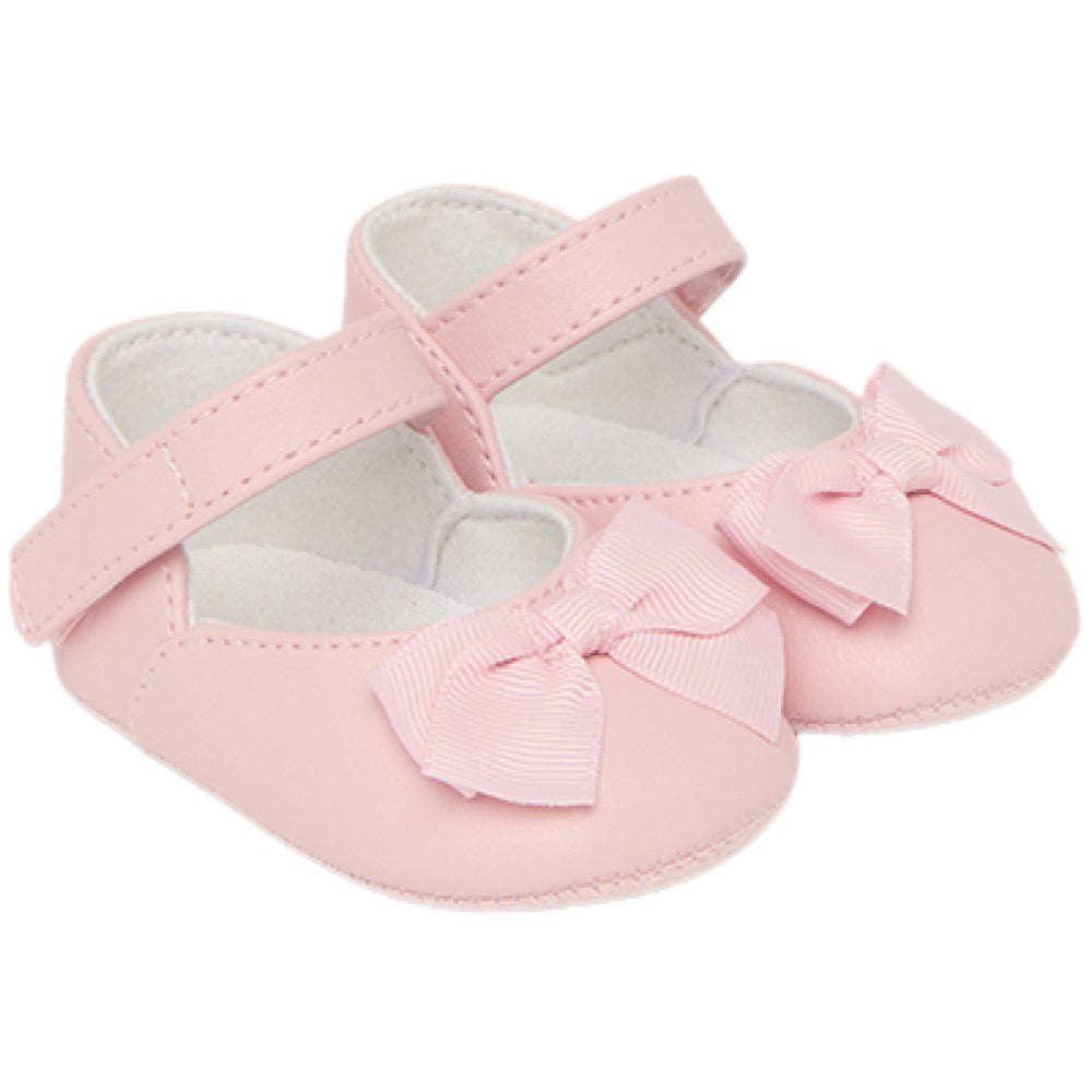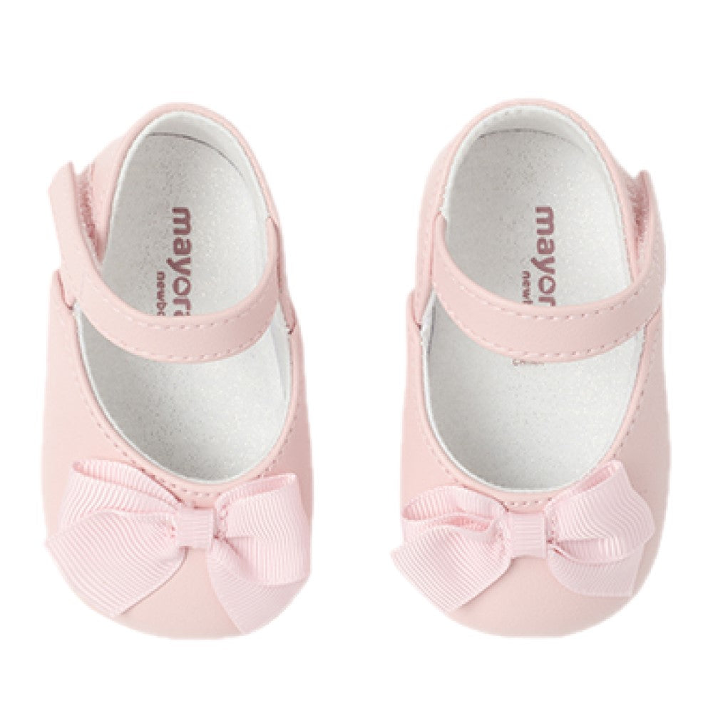 Zapato MAYORAL modelo cuna con lazo aplicado, cierre de velcro ajustable, corte y planta interior de algodón. Banda elástica coordinada con lazos aplicados.