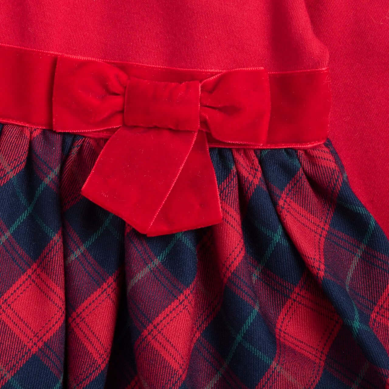 Vestido CHICCO rojo escocés, con parte superior en interlock elástico y parte inferior en franela con estampado tartán, falso cinturón con lazo de terciopelo. Cálido forro de algodón y enagua de tul. Apertura trasera con cremallera para todas las tallas.
