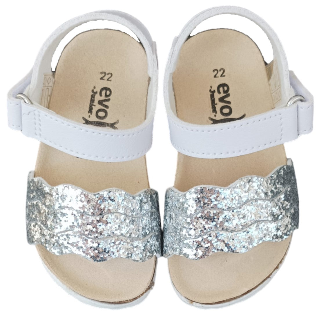 Las sandalias evocan en ecológico, cierre con rotura ajustable, aplicación de brillo, plantilla de cuero anatómico real, fondo de goma. Hecho en Italia