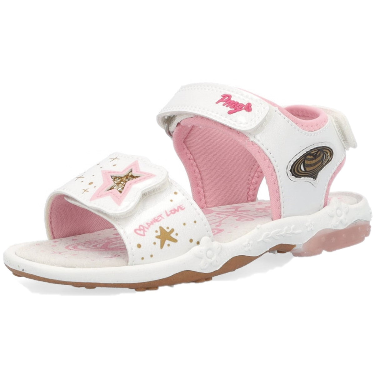 Sandalias Primigi con cierre de velcro triple ajustable, modelo con luces que se activan en contacto con el suelo, brillo aplicado, logotipo bordado aplicado, subsidios de cuero real, fondo de goma sin ventilador.