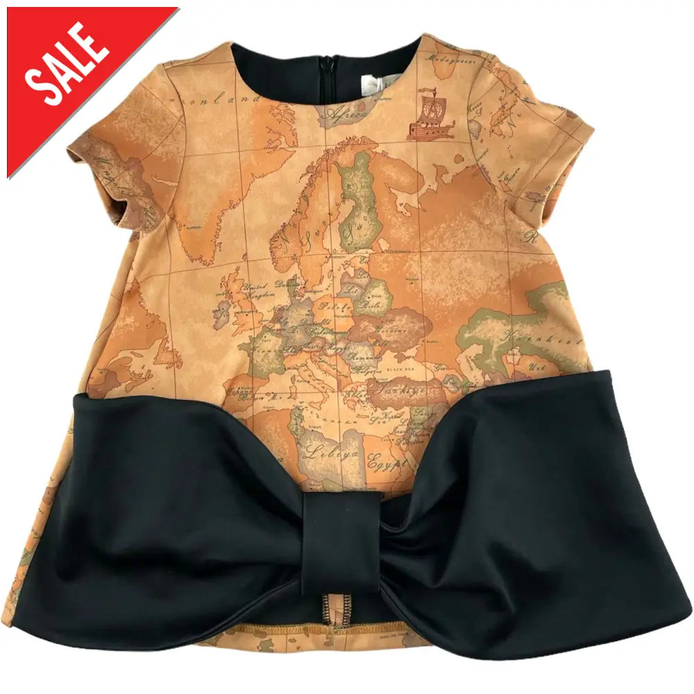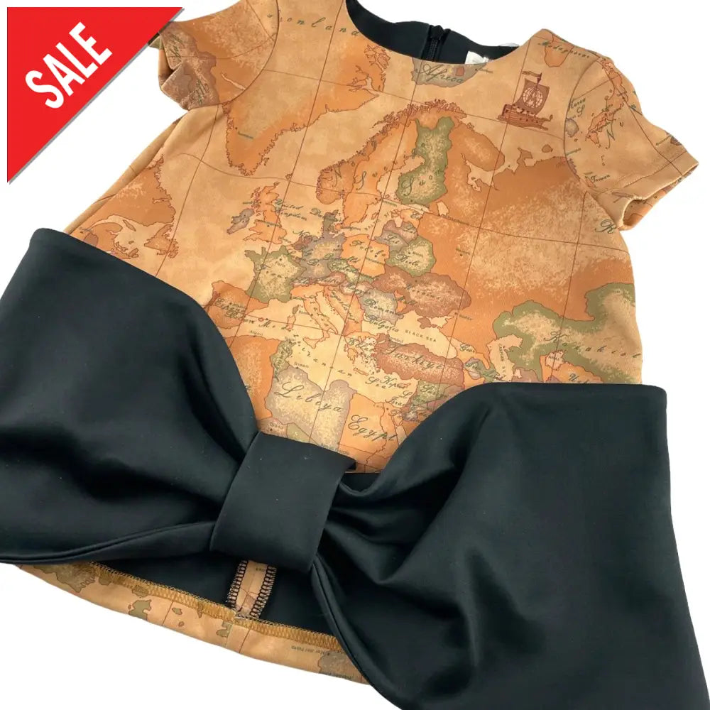 Vestido ALVIERO MARTINI 1 CLASSE en tejido técnico con colorido institucional Alviero Marti y maxi lazo negro a contraste. Cierre de cremallera oculta en la espalda.