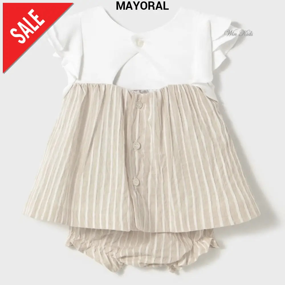 Abito MAYORAL in cotone con chiusura bottoncini sul retro ,rouches al giro manica ,foderato in cotone. In coordinato copri pannolino in cotone.