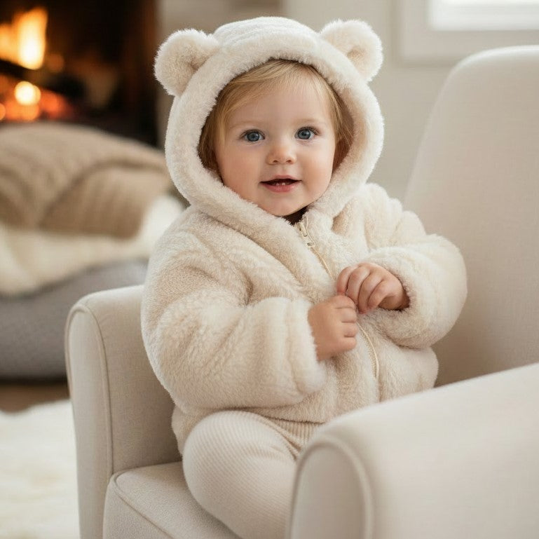 Pelliccia MONNALISA modello teddy con cappuccio e chiusura zip tasche a cuore frontali polsino e vita elastici.