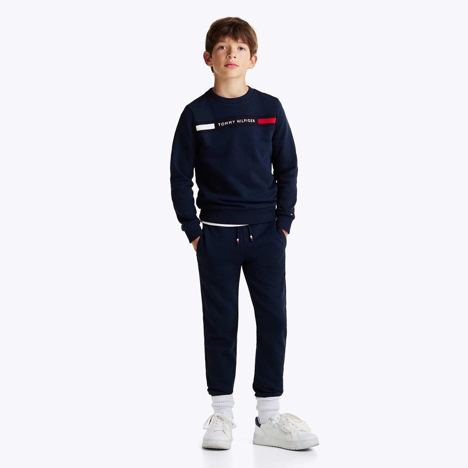 Tuta TOMMY HILFIGER con interno garzato in cotone , composta da felpa con logo ricamato e pantalone con elastico e laccetto regolabile in vita.
