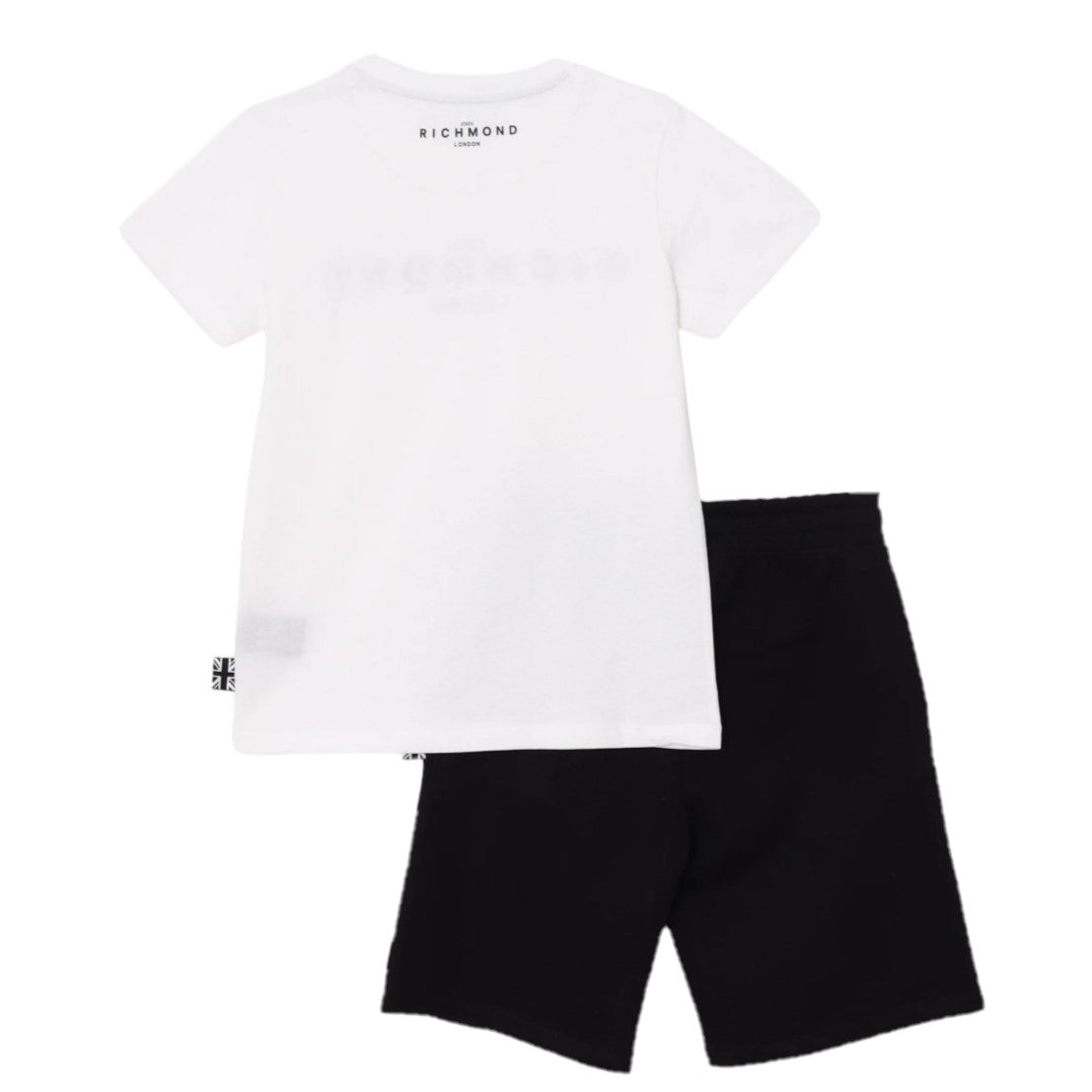 Completo JOHN RICHMOND in cotone composto da t-shirt mezza manica modello girocollo con logo stampato a contrasto ,bermuda con interno garzato in cotone , elastico in vita con laccetto ,tasche laterali e logo stampato a contrasto.