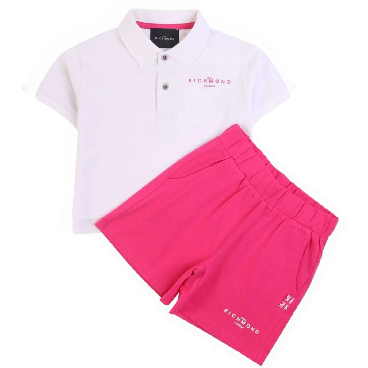 Completo JOHN RICHMOND da bambina in cotone composto da polo modello cropped con stampa a contrasto sia sul retro che frontale e spacchetti laterali ,colletto applicato e chiusura con bottoni ,shorts con elastico in vita e logo stampato a contrasto,tasche laterali .
