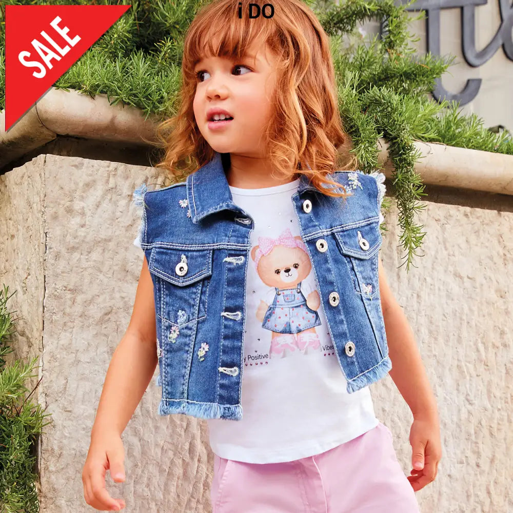 Gilet I DO in jeans con rifiniture a taglio vivo e ricami, chiusura con bottoni.