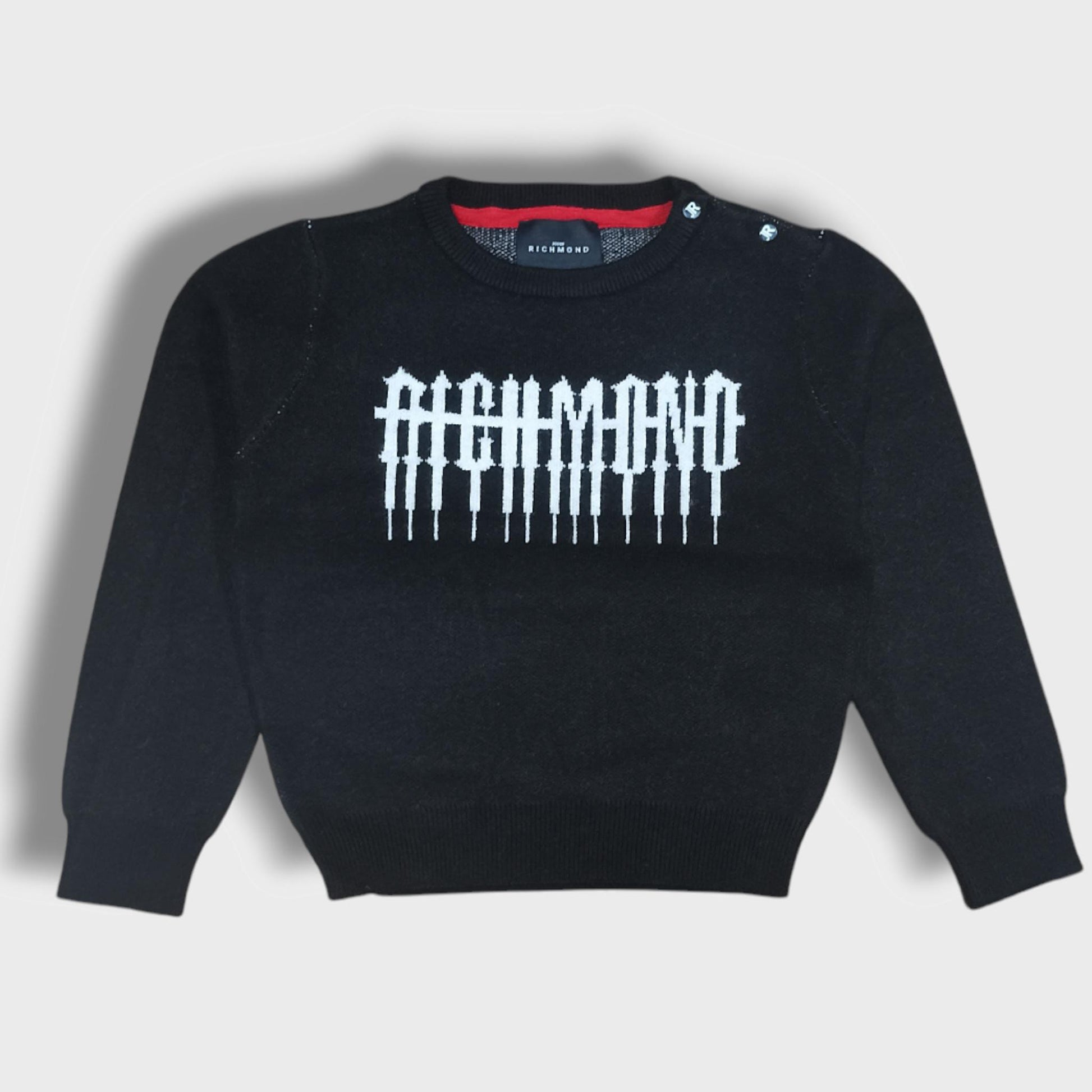 Maglione JOHN RICHMOND con logo in colore a contrasto nella trama, chiusura con clips logate su spalla.