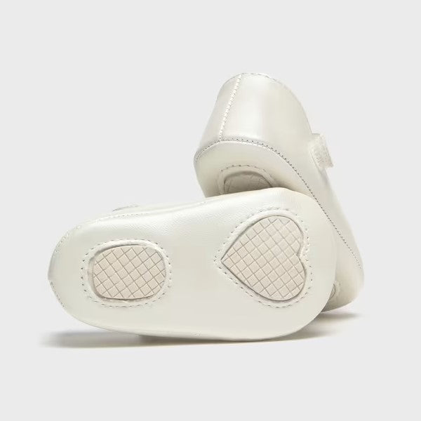 Scarpe MAYORAL modello ballerina, linea culla, in vernice con pom pon in ecopelliccia applicato, chiusura con velcro.