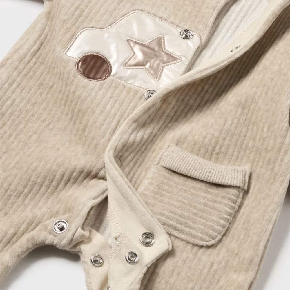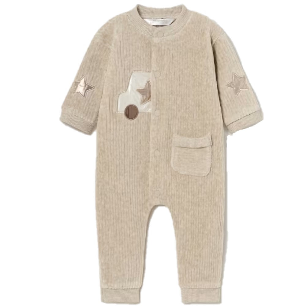 Tutina MAYORAL in ciniglia con chiusura clips ,patchs e taschino applicati ,inserti elastici alla caviglia e al polsino.