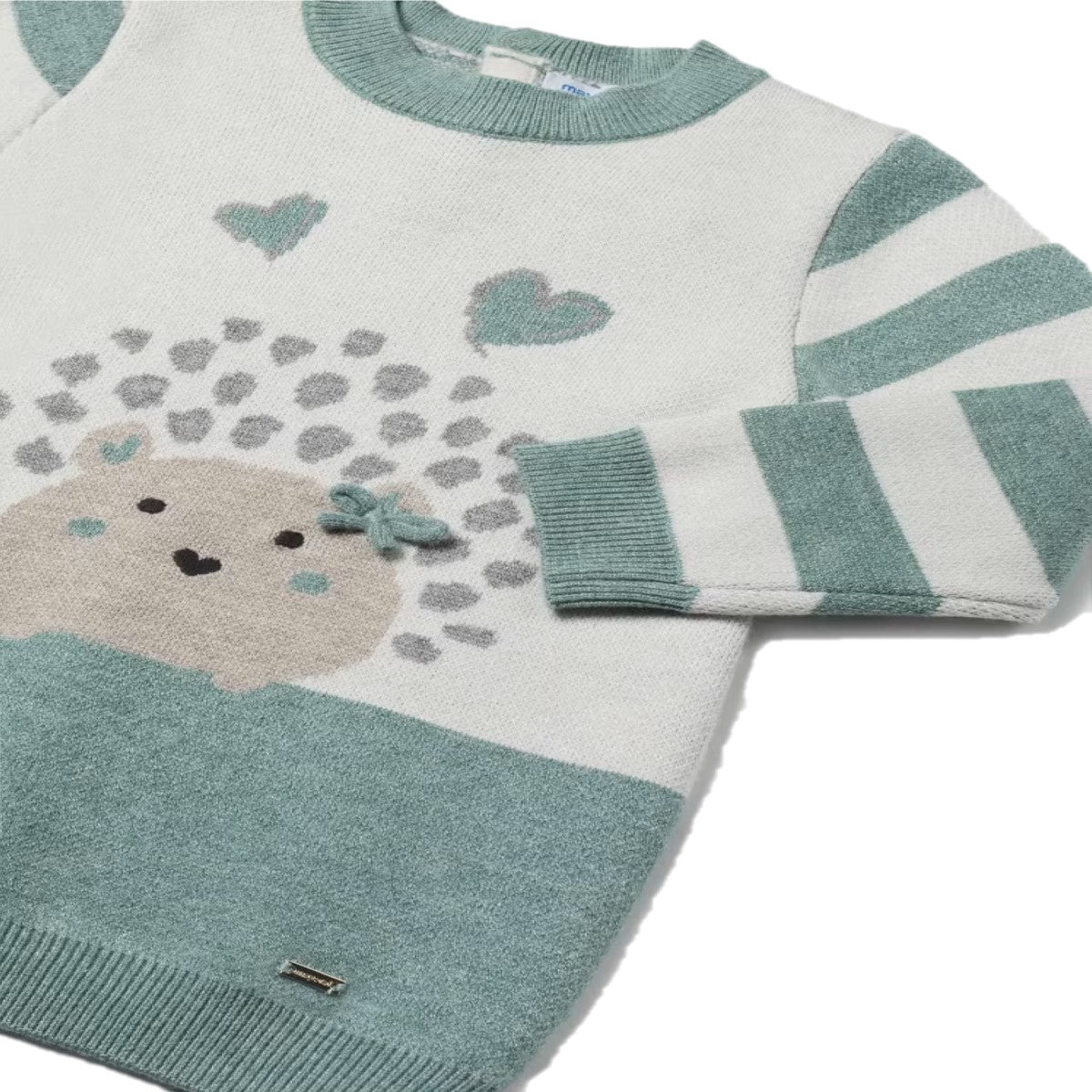 Abito MAYORAL a fantasia in colori a contrasto, fiocchetto applicato, chiusura con bottoncini sul retro.