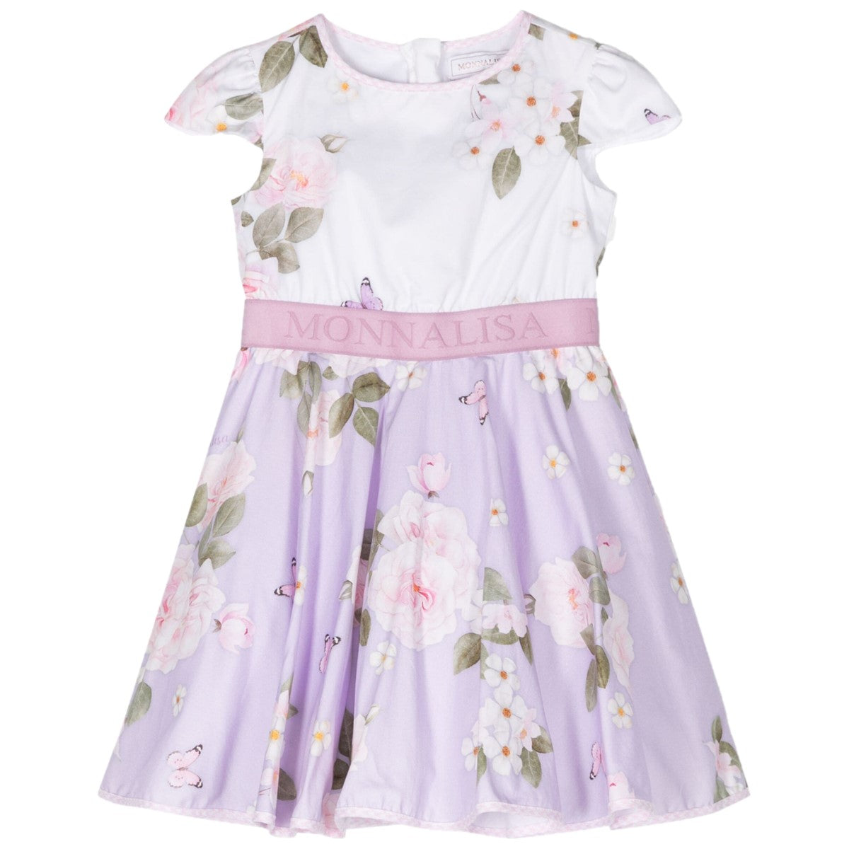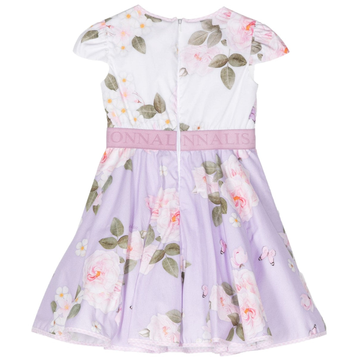 Abito MONNALISA in cotone a fantasia floreale logata in colori a contrasto, elastico logato in vita, chiusura con zip sul retro, fodera interna in cotone con balze in tulle applicate.