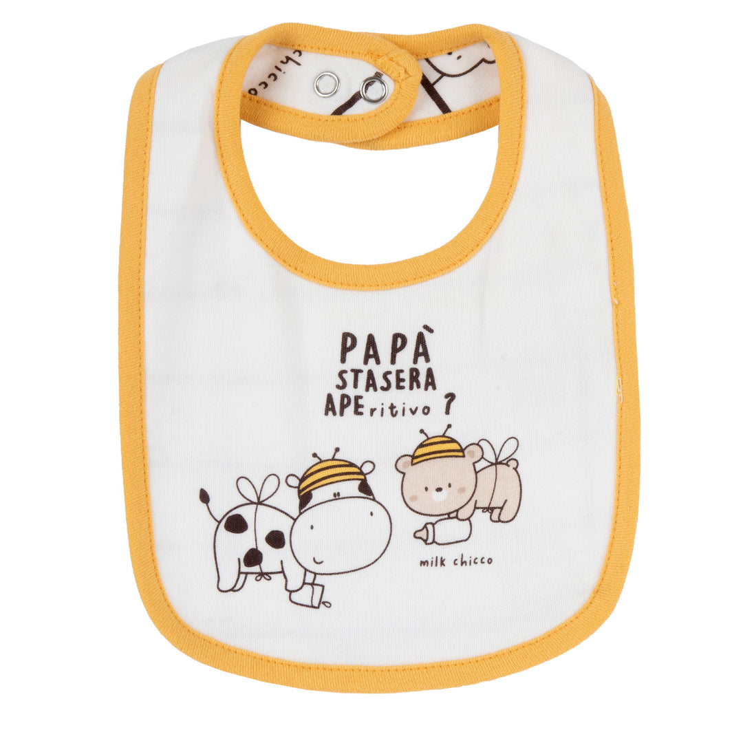 Bavetta CHICCO in cotone con stampa e logo stampato applicato in colori a contrasto, retro a fantasia logata, chiusura con clips regolabile.