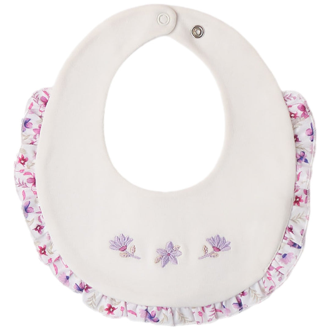 Bavetta MINIBANDA in cotone con ricami applicati in colore a contrasto, rouche a fantasia floreale applicata, chiusura con clips regolabile.
