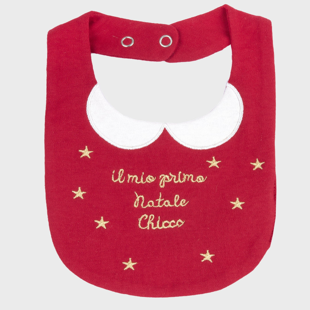 Bavetta Natale CHICCO in cotone con ricami applicati in colore a contrasto, chiusura con clips regolabile sul retro.