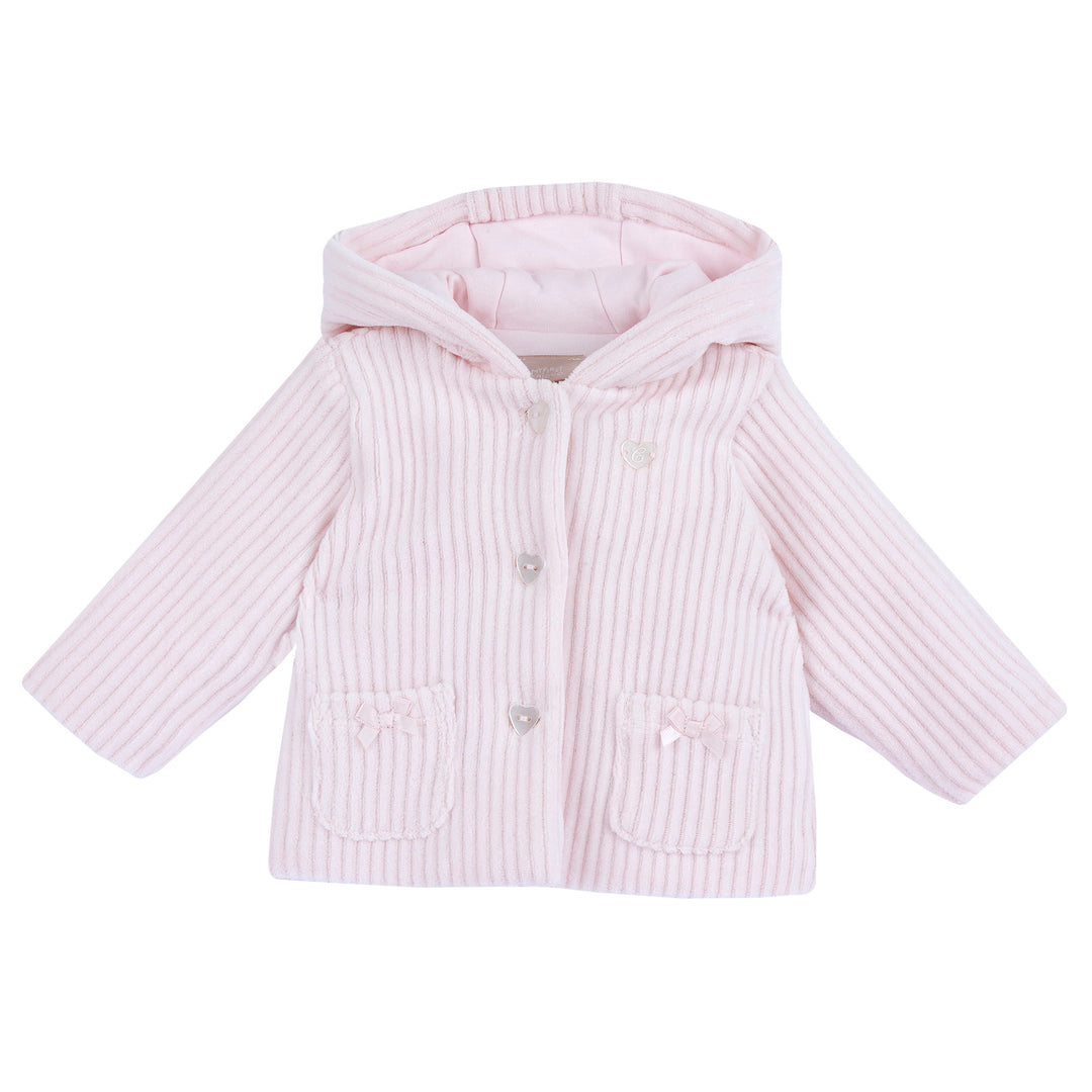 Cappottino CHICCO in morbida ciniglia a costine con cappuccio, taschine applicate con fiocchetti in tessuto a contrasto, logo applicato a rilievo, chiusura con bottoncini a cuoricino, fodera interna in cotone.