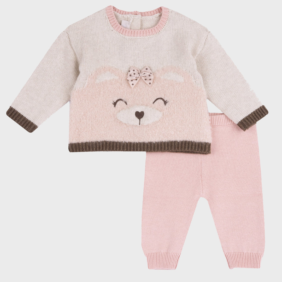 Completo CHICCO con maglioncino in misto lana con ricami e fiocco a fantasia pois applicato, chiusura con bottoncini sul retro, leggings in caldo cotone con elastico in vita.
