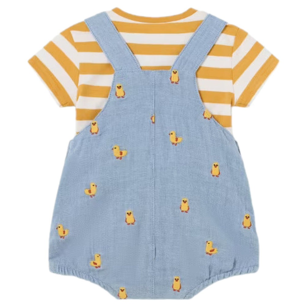 Completo MAYORAL con t-shirt in cotone a fantasia rigata con chiusura clips su spalla, salopette a fantasia ricamata in colore a contrasto, bretelle regolabili mediante bottoncini, chiusura con clips, taschino e logo applicato.