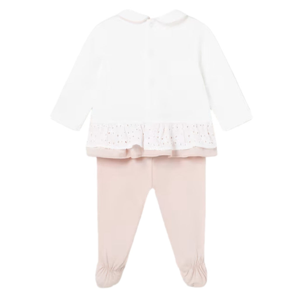 Completo MAYORAL in cotone composto da t-shirt con colletto applicato, patch a rilievo applicati in colore e tessuto a contrasto, rifiniture in pizzo san gallo, chiusura con clips sul retro, e ghettina con fascia elastica in vita.