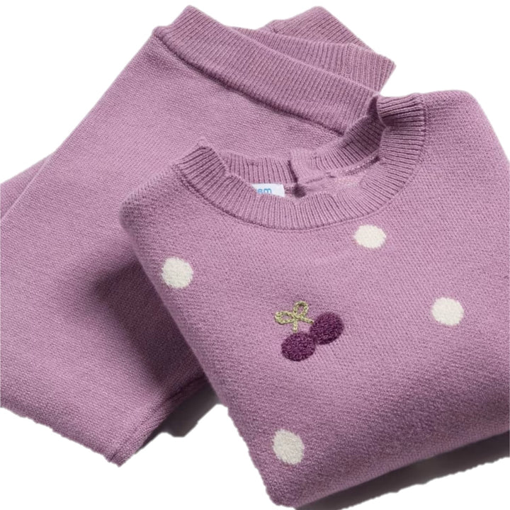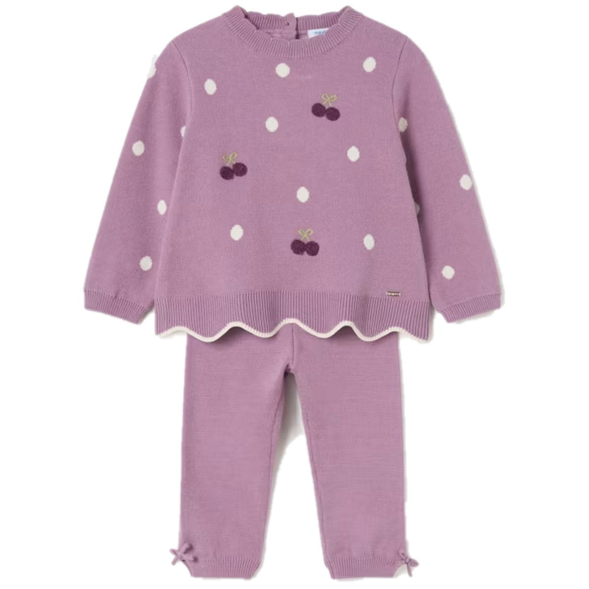 Completo MAYORAL con maglioncino a fantasia pois in colore a contrasto, ricami applicati, chiusura con bottoncini sul retro, logo applicato in metallo; pantalone con elastico in vita e fiocchetti applicati alle caviglie con spacchetti laterali.