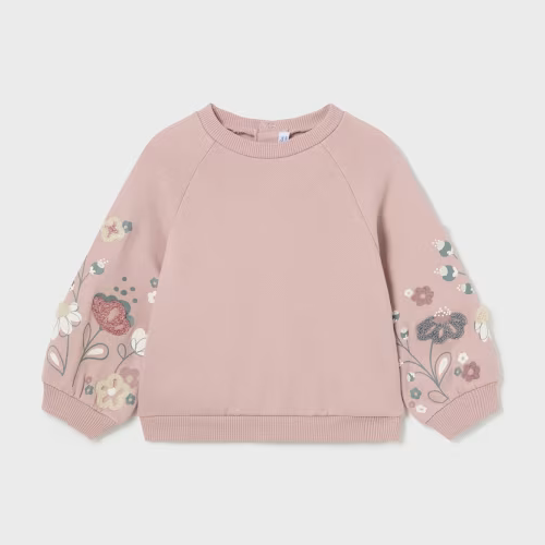 - felpa con stampe e ricami applicati alle maniche in colori a contrasto, chiusura con clips sul retro;