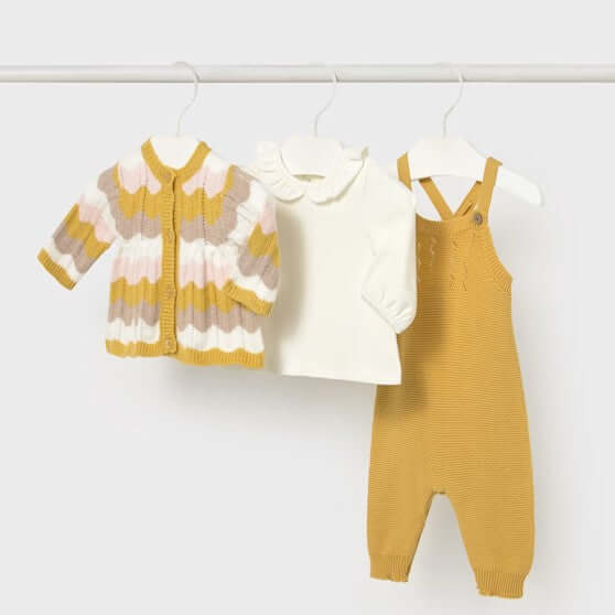Set completo in tricot morbido: salopette, maglietta e cardigan per un look adorabile!