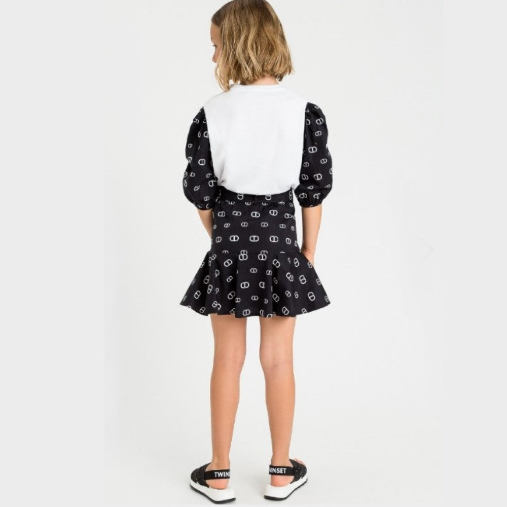 Completo TWINSET composto da T-shirt in cotone con manica a sbuffo logata inserto elastico al polso logo in metallo applicato gonna in cotone con logo a contrasto chiusura zip laterale. In coordinato cintura in cotone logata.