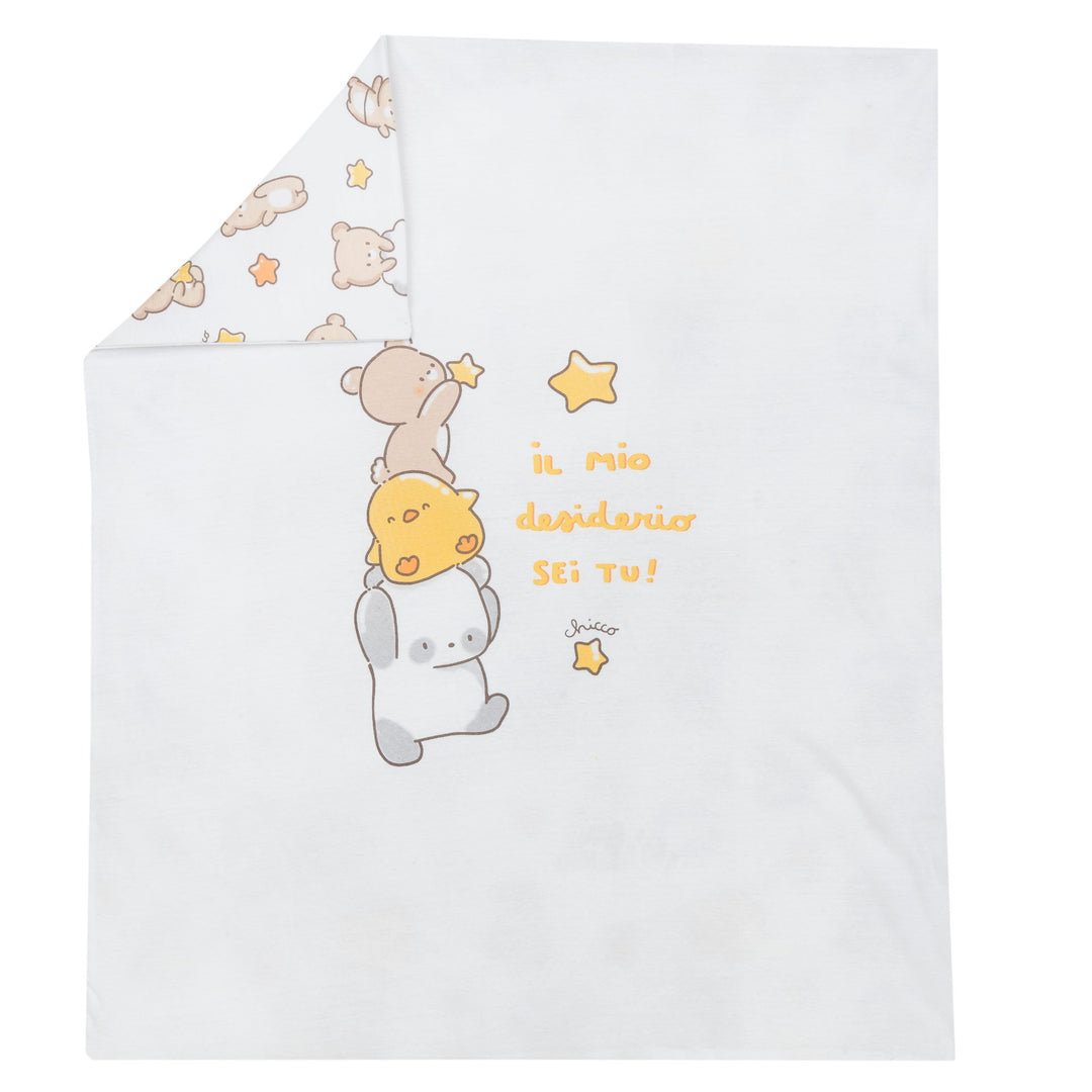 Coperta CHICCO in cotone con stampa e logo stampato applicato, sul retro fantasia logata stampata in colori a contrasto, modello da carrozzina.