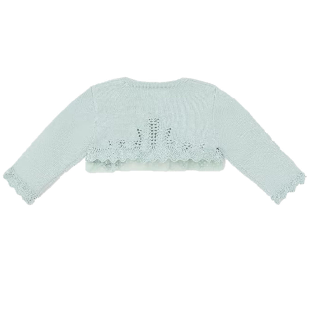 Coprispalle cardigan MAYORAL in verde con rifinitura lavorate e tule applicato.