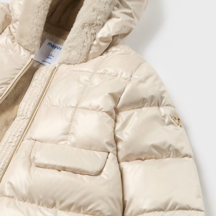 Giubbotto bambina MAYORAL zip intera, modello con cappuccio e bordatura in ecopelliccia.