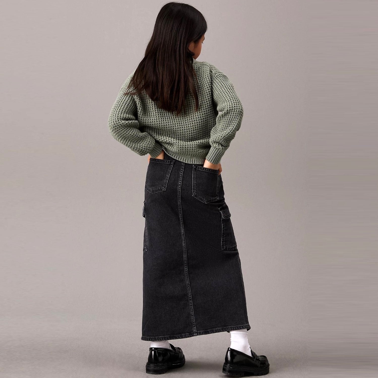 Gonna CALVIN KLEIN in tessuto denim vintage stile 5 tasche con spacco davanti ,regoli in vita , chiusura bottone logato e zip , tasconi laterali con logo ricamato .