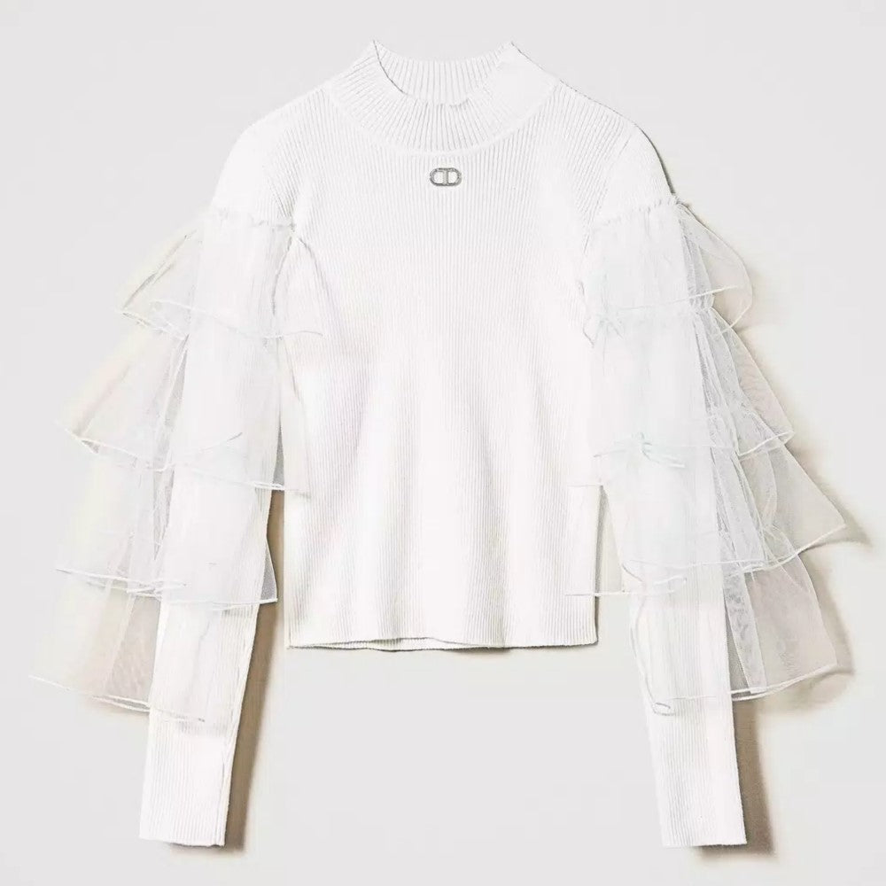 Maglioncino TWINSET a costine modello lupetto con balze in tulle alle maniche logo in metallo.