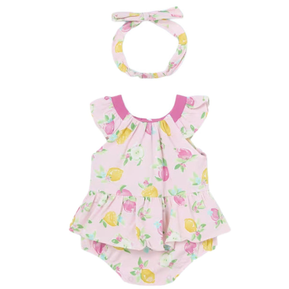 Pagliaccetto MAYORAL in cotone a fantasia in colori a contrasto, voilant applicato in vita, chiusura con clips ed elastico applicato al giro gamba, chiusura con bottoncino e fiocco applicato sul retro. In coordinato fascia in cotone a fantasia con finto fiocco ed elastico sul retro.