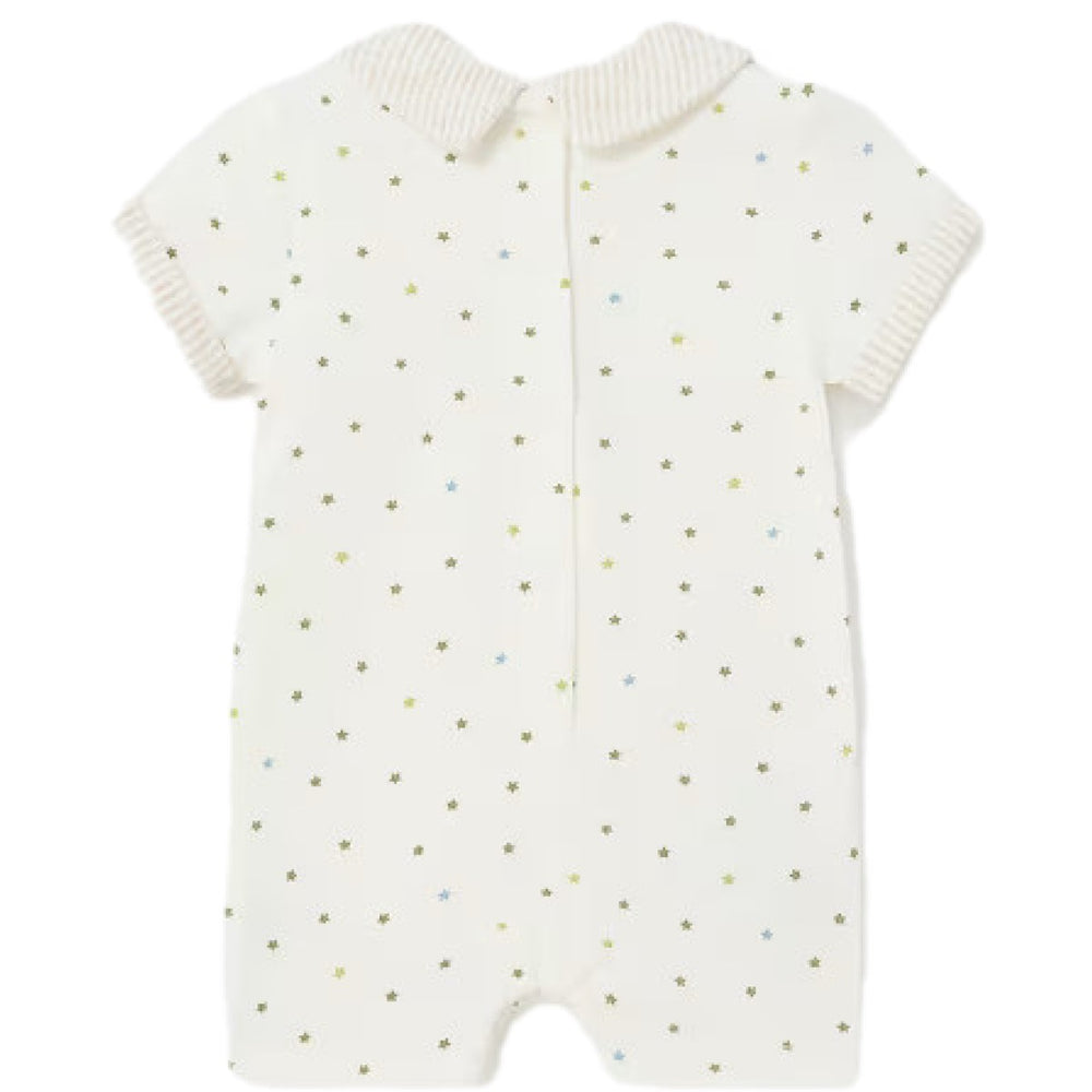 Pagliaccetto MAYORAL in cotone a fantasia stelline in colore a contrasto con patch orsetto applicato, rifiniture a fantasia rigata, bottoncini applicati alle finte tasche, chiusura con clips sul retro.