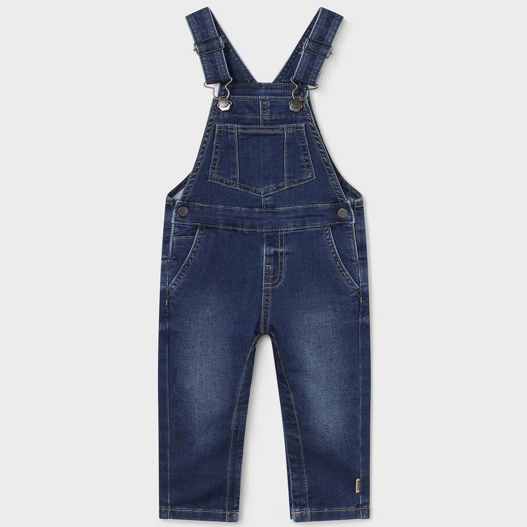 Salopette MAYORAL in tessuto soft denim effetto vintage con chiusura clips sia laterale che nella parte inferiore , bretelle regolabili ,tasche laterali e sul retro.