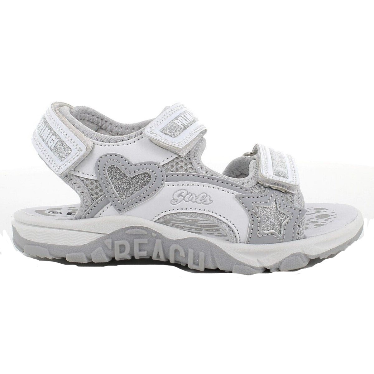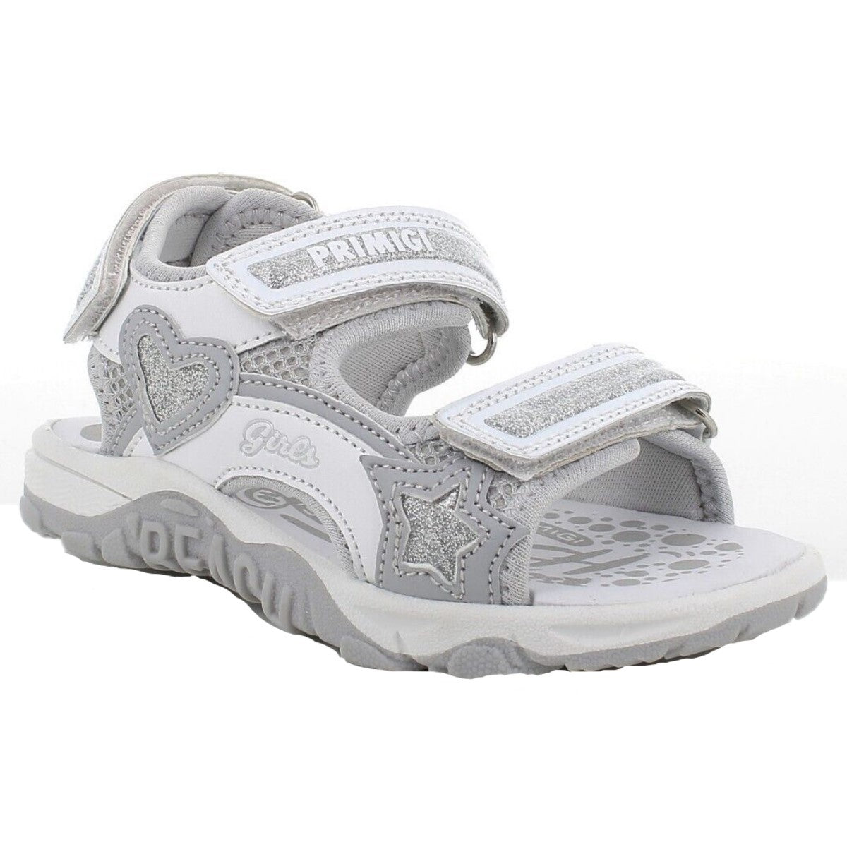 Sandali PRIMIGI con chiusura triplo velcro regolabile, inserti in glitter, loghi stampati applicati, fondo in gomma antiscivolo.